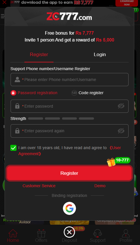 Joining ZC777 Game is quick and simple. Just click the Sign Up button, fill in your basic details, choose a username, and you can start playing instantly. For faster access, players can also log in using their Google or Facebook accounts.